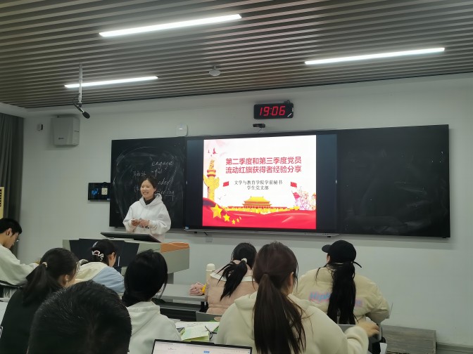 为充分发挥党员的先锋模范作用和榜样引领作用,11月20日晚,文学与教育学院学前秘书学生党支部在B520、B512开展党员流动红旗经验交流会。党支部第二季度和第三季度“流动红旗”获得者吴嘉怡、钱雨琼、王天天和葛永幸同学进行交流分享。2023级学前教育同学全体参加。