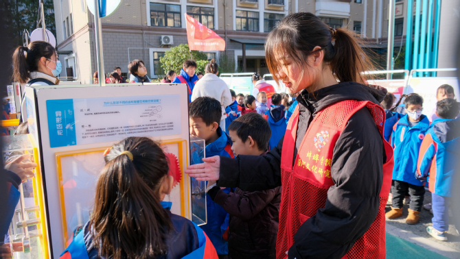 在蚌埠市和煦小学的教学楼前,小学生在班主任的引导下有序参观淮河生态文明流动展板,淮河文化大学生讲解团成员深入浅出地为小学生讲解了生态系统之间的关联,并结合小学生的生活实际让小学生理解山水林田湖草沙构成相依共存、有机关联的生命共同体。