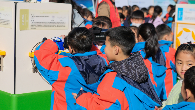 “同学们看,为什么两个质量相同的圆轮滚动的速度却不一样呢?”讲解员玉恒斌一边为小学生们作演示,一边提出问题引导小学生们对质量与速度的知识产生思考,同时引导小学生手眼协调、短期记忆测试、视觉体验等多项活动,指导小朋友们通过异性齿轮,VR眼镜各项体验工具对力与数学、虚拟技术有了初步了解。