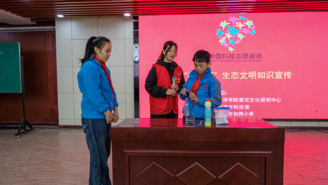 在讲解员志愿者的带领下,孩子们又来到阶梯教室聆听讲解员准备的“精彩一课”。讲解员董弋徽为小学生们展示了生态环保的小实验。小朋友们立刻被吸引,不时听到孩子们的轻“哇”声。在课程的学习中,孩子们逐渐了解淮河文化的知识,他们认识了环境污染对于淮河的危害,学习如何保护环境,如何减少污染。