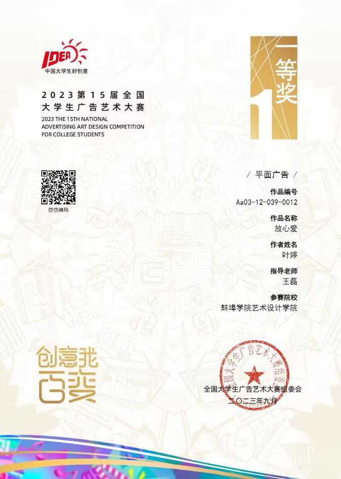 11月25日,全国第十五届全国大学生广告艺术设计大赛颁奖典礼落下帷幕,我校艺术设计学院教师王磊指导的视觉传达设计专业叶婷同学的作品《放心爱》荣获国家级一等奖,实现我校在该项赛事中的突破。