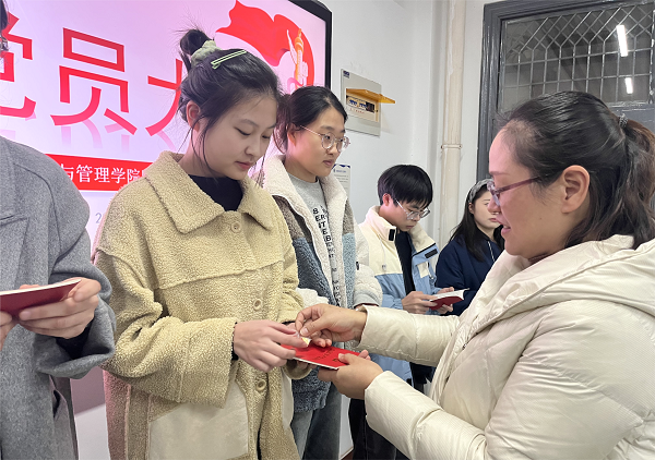 随后,支部委员会三位老师为新发展的党员佩戴党徽,赠送党章,并带领新发展的预备党员进行入党宣誓,全体党员一起重温入党誓词。