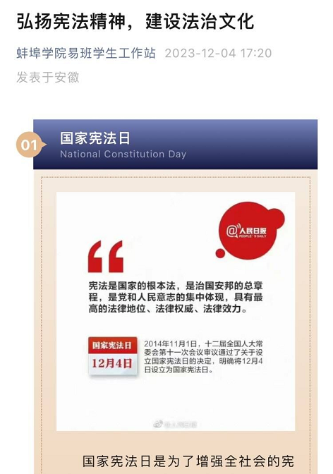 营造学法氛围,提升宣传实效。各学院积极动员广大学生学法、崇法,将宪法宣传落到实处。利用班级QQ群、微信群、微信公众号等开展宪法宣传,以线上线下相结合的方式,组织学生进行宪法宣誓,督促学生完成网上宪法知识学习。易班学生工作站利用易班网开展宪法宣传活动,让同学们体会宪法重要地位,自觉维护宪法权威,扎实推动宪法宣传活动做好、做实。