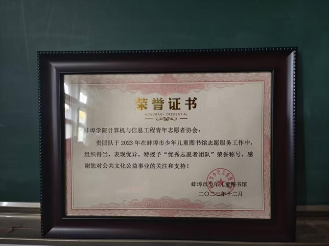2023年12月3日,蚌埠市图书馆、蚌埠市少年儿童图书馆举办了2023届优秀志愿者表彰大会,对志愿服务表现突出的志愿者及团队进行表彰。在此次表彰大会上,计算机与信息工程学院青年志愿者协会荣获“优秀志愿者团队“的称号。