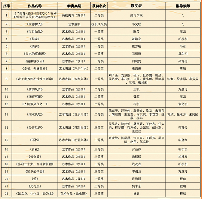 近日,安徽省教育厅公布第七届大学生艺术展演活动各项目评选获奖名单,我校在本次艺术展演中取得优异成绩,并获得校长风采奖1项、一等奖5项、二等奖7项、三等奖9项,学校荣获优秀组织奖。