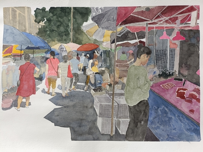 艺术作品(绘画)一等奖,《周末菜市场》,作者:卫星缘,指导教师:袁之明