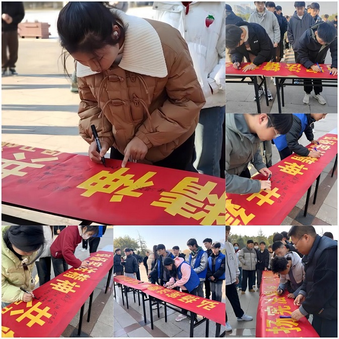 活动中,志愿者们在图书馆西门国旗下开展“弘扬宪法精神,共创和谐校园”签名活动,在学校各食堂入口向学生宣传宪法等法律法规内容。通过悬挂横幅、摆放展板、传单发放、自愿承诺签名等方式,引领大家普及宪法知识并结合事例分析,同学们郑重地在横幅上签下承诺。广场上,五星红旗迎风飘扬,宪法宣传标语醒目而庄重,同学们的学习兴趣高涨,互相探讨宪法学习心得。