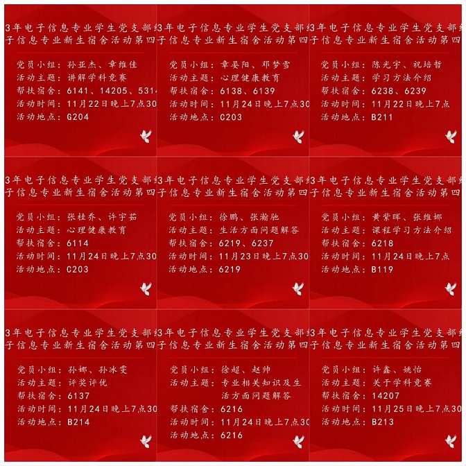 为帮助2023级新生更好地适应大学生活和学习,2023年11月22至25日,电子信息专业学生党支部秉持为新生“解疑惑、办实事”的原则,深入新生寝室开展第四期学生党员结对新生宿舍活动,做好入党启蒙、学科竞赛、志愿服务、学生活动等引导,与新生们展开积极交流。