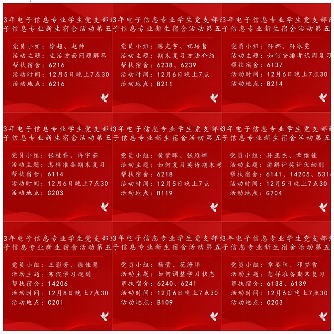 为进一步贯彻落实党员结对新生宿舍活动,更好地发挥学生党员的服务意识和榜样作用,帮助新生更好地适应大学的学习生活,电子信息专业学生党支部于12月5日至8日开展第五期学生党员结对新生宿舍活动。