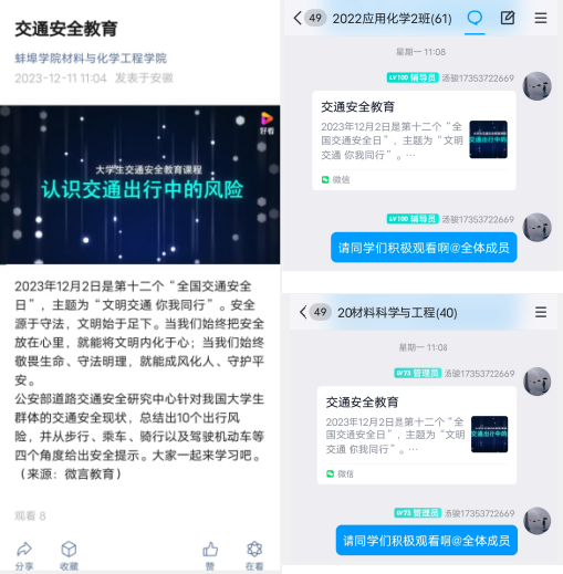 材料与化学工程学院在学院官方微信公众号和班级QQ群等线上平台上发布交通安全教育课,向师生宣传校园交通安全知识,对师生进行交通安全警示教育。引导学生增强“知危险会避险”交通安全理念,提升安全出行的意识,养成文明出行习惯。