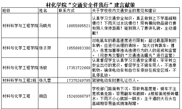 材化学院积极组织学生围绕共建交通安全校园,提出自己的意见与建议。发挥学生的主人翁意识,为建设安全和谐的美丽校园建言献策。
