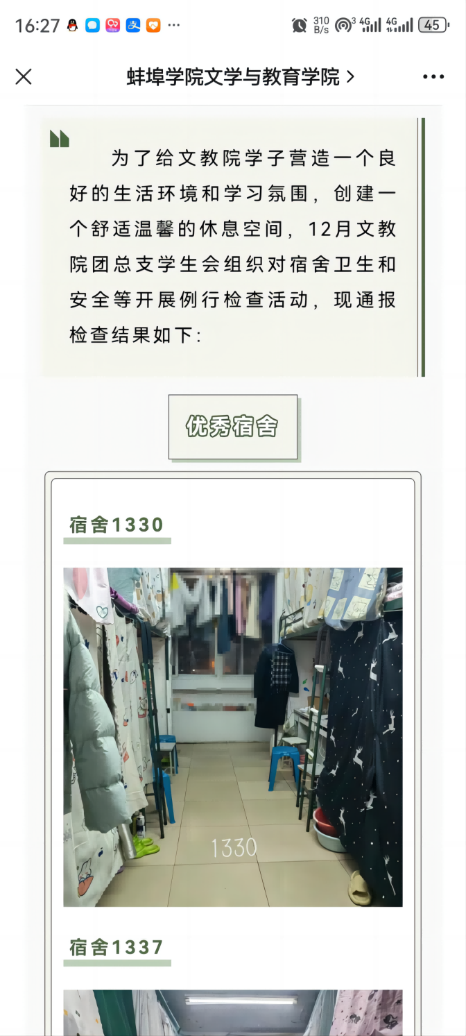 为营造安全、整洁的宿舍环境,督促同学们保持宿舍整洁,消除宿舍安全隐患,自开学起文学与教育学院每月开展一次宿舍安全、卫生检查,并将每次检查结果公布于文学与教育学院官方公众号上,对优秀宿舍予以表彰,对较差宿舍督促改进。通过宿舍安全卫生常态化检查,创造健康安全、舒适温馨的宿舍大家庭。