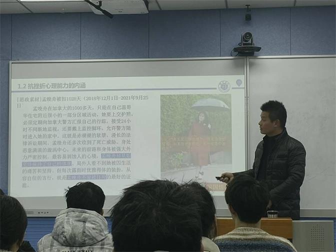 本次公开课教学展示的主题为《抗挫折心理能力—从挫折中学习》,由丁浩老师主讲。该课程思政教学设计挖掘了道路自信、家国情怀、国家富强、百折不挠、优秀传统文化等5个思政元素,把朱德的坚定自信等5个思政素材融入到教学设计中。其中,“朱德的坚定自信”素材融入挫折内涵的讲授,“孟晚舟在逆境中的不屈不挠”素材融入抗挫折心理能力内涵讲授和抗挫折心理能力训练,“中国高铁在历经磨难后的蒸蒸日上”和成语典故“艰难困苦,玉汝于成”两个素材融入挫折经验的讲授,“中国北斗卫星导航突破封锁取得突破的历史”素材融入挫折认知水平的讲授。在教学展示过程中,采用了讲授、案例分析、行为训练等教学方法。