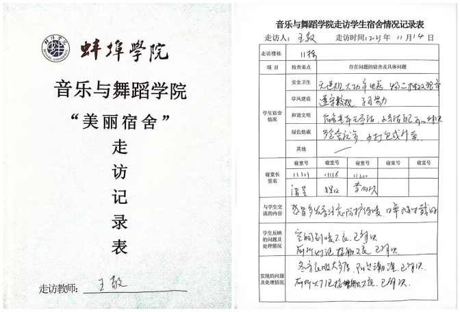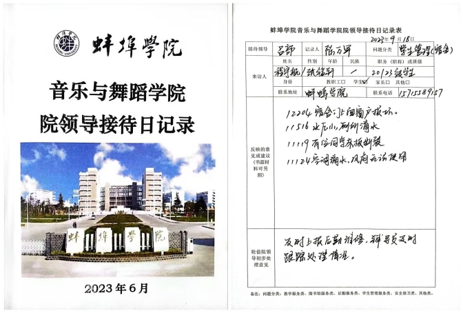 音乐与舞蹈学院把贯彻落实《蚌埠学院美丽宿舍建设攻坚行动方案》作为“我为师生办实事”一项重要工作来抓。学院制定了《音乐与舞蹈学院美丽宿舍建设攻坚行动领导小组》,书记院长任组长,副书记副院长任副组长,成员包括辅导员、教研室主任、专业负责人、学业导师、教学督导、教师代表和学生代表,明确职责分工、建设目标、细化建设任务、制定建设措施;编制印发了《音乐与舞蹈学院“美丽宿舍”走访记录登记表》,形成了看望学生和检查宿舍的闭环管理;开通了音乐与舞蹈学院宿舍建设意见与建议书记院长信箱和邮箱,并与《音乐与舞蹈学院院领导接待日实施办法》一道密切了师生之间的距离,为解决学生“急难愁盼”宿舍问题保驾护航。