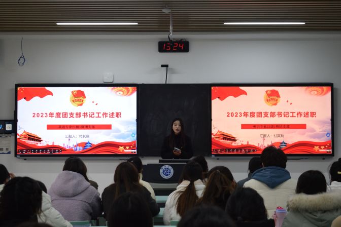 为了加强共青团组织建设,切实发挥团支部书记带头模范的作用,促进团干部综合素质的提高,12月26日,外国语学院开展2023年度团支部书记述职评议会。外国语学院党委书记赵睿、党委副书记周颖、党务秘书王刚、辅导员吴金玥出席本次会议。会议由团总支副书记王娜娜主持。