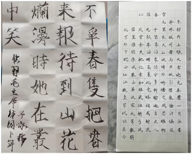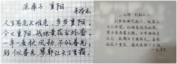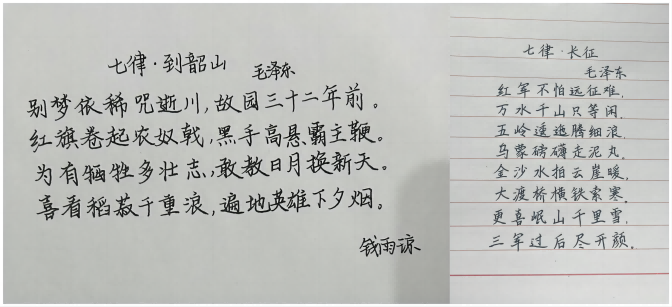 活动中,支部党员书写了《沁园春·雪》《七律·长征》等44首毛泽东诗词,大家在书写的过程中感受毛泽东主席诗词里强大的精神力量和深厚的爱国主义情怀。经评选,王天天等10名同学的作品被评为“优秀书写作品”。