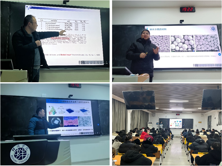 于晓锋、宋任远、杨庆敏和武英龙分别做了题为《手性金属配合物合成及其立体选择催化丙交酯合成聚乳酸的研究》、《基于聚乳酸泡沫疏水材料界面的调控及其油水分离的应用》、《基于蛋白质类淀粉样聚集的金属离子吸附材料》和《低共熔溶剂分离木质素及其纳米粒子制备与应用》的学术报告,详细的介绍了生物基材料团队的近期研究成果,并强调科学研究要以市场为导向,紧贴行业技术需求,助力解决企业的技术难题。会后,广大师生就报告内容展开了一系列的学术讨论与交流,加深了同学们对聚乳酸、木质素等生物基材料的应用与科研过程的印象,有效地提高了同学们对科研的兴趣。