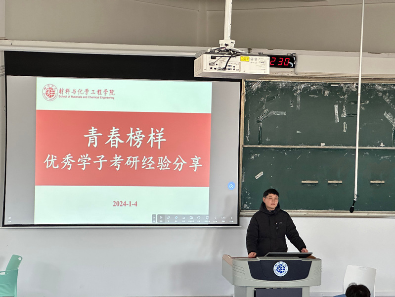 为了进一步激发2021级同学的考研热情,了解考研信息,掌握备考技巧,1月4日中午,材料与化学工程学院在阶梯教室4通过腾讯会议的方式举办了优秀校友考研经验分享会。会议邀请了江南大学陈熠、中国科学技术大学杨锐锐、合肥工业大学占强胜、大连理工大学王新雨和南京工业大学刘星伟等2023届五位在读研究生校友担任主讲,活动由辅导员陈浩主持,辅导员朱泽伟、 2021级有意考研的同学参加了讲座。