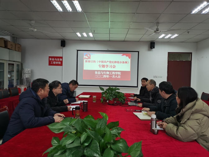 2024年1月8日,食品与生物工程学院二级理论学习中心组召开学习会,专题学习《中国共产党纪律处分条例》(2023年最新修订),学习会由党委书记王永斌主持,全体班子成员参加学习。