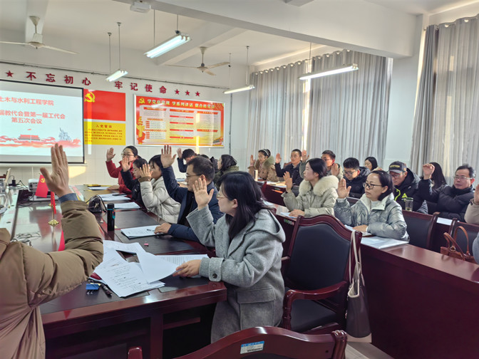 2024年1月11日下午,土木与水利工程学院第一届教代会暨工代会第五次会议在学院会议室召开,会议由院党委书记张兆亮主持,院长戚晓明、副书记芦永萍、副院长朱兰保及全体教师参会。