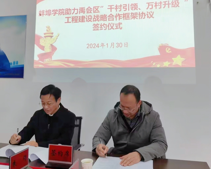 为进一步加深深化交流合作,1月30日,蚌埠学院助力禹会区“千村引领、万村升级”工程建设战略合作框架协议签约仪式在禹会区长青乡涂山村举行,蚌埠学院党委副书记、院长孙艳辉,禹会区委副书记、区长张斌代表双方签字。