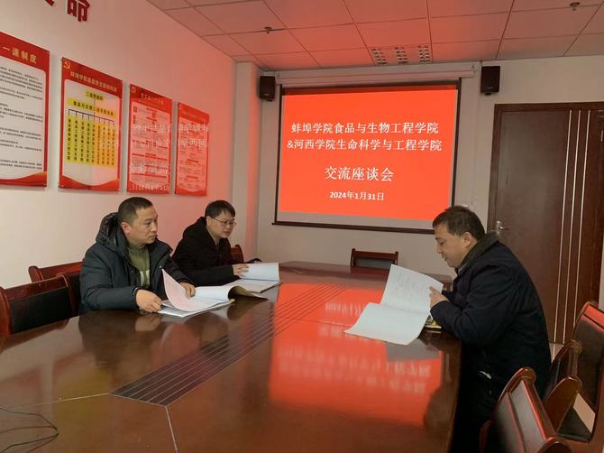 1月31日上午,河西学院生命科学与工程学院副院长曹礼来食品学院访问交流,蚌埠学院食品与生物工程学院院长张斌、副院长马龙、实验中心主任赵大庆热情接待了来宾。