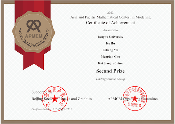 近日,第十三届亚太地区大学生数学建模竞赛(APMCM)成绩揭晓,由数理学院姜奎老师指导的袁杰、宋朝晖、汤步健和胡可、马二康、褚孟君两组参赛队伍获国际二等奖(Second Prize),这是我校首次获得该赛事奖项,实现历史性突破。