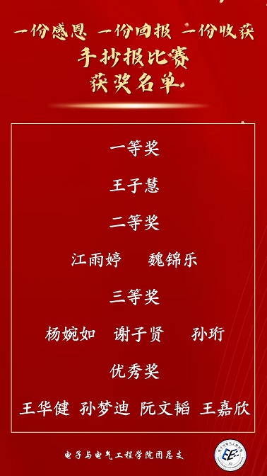 “滴水之恩,当涌泉相报”。为大力弘扬和践行社会主义核心价值观,落实立德树人根本任务,广泛深入推进感恩教育,电子与电气工程学院于2月1日至2月14日开展“一份感恩,一份回报,一分收获”主题手抄报比赛活动。