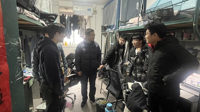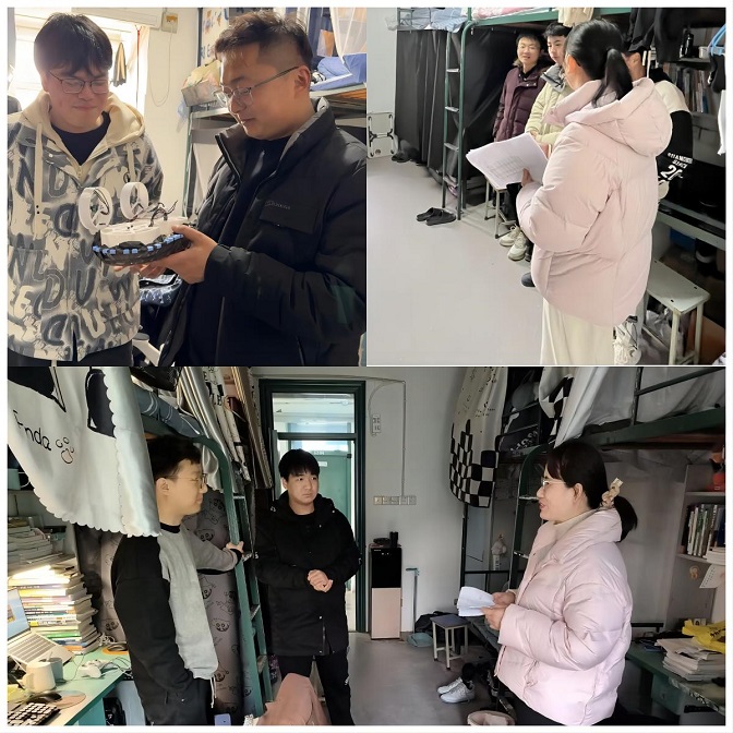 寝室走访过程中,学院领导、老师们认真察看学生宿舍内空调、照明、床位、卫生间等设施是否正常使用,与同学们进行了深入的交谈,逐一询问同学们近况,对大家假期的学习情况和身体状况进行了详细了解,并关注学生的诉求。叮嘱同学们注意防范电诈、安全用电,强化安全意识和相互监督;强调要及时调整生活作息,认真规划新学期的学习;鼓励同学们养成良好的学习、卫生和文明习惯,保持青春活力的大学生形象;嘱咐同学们加强身体锻炼。最后要求同学们尽快调整状态,以最好的精神面貌投入新学期的学习生活中。