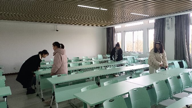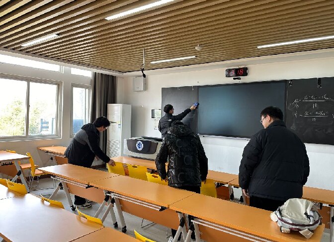 活动当天,在简单分工后,支部全体党员开始教室清扫工作。志愿者们在讲台上擦拭黑板上的字迹,检查粉笔和板擦的配备情况,确保教学不受影响;在教室内将杂乱的桌椅重新归位;协助学校清洁人员清理教室垃圾。志愿者们团结协作、配合默契,清扫志愿活动全程有序地进行。