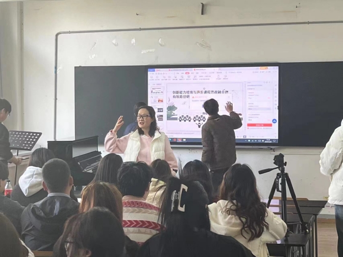 3月20日下午,风和日丽,阳光明媚,艺术楼传来阵阵歌声,音乐与舞蹈学院曹万玲老师在E105开展了声乐思政课程公开课。