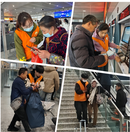 在校园外,志愿者们来到了蚌埠南站,身穿醒目的橙色马甲,积极投入到志愿服务中。他们协助旅客在自助购票机取票购票,引导旅客有序进出车站,帮助携带重物的旅客搬运大件行李。在扶老携幼、答疑解惑的过程中,他们用自己的热情和耐心温暖了每一位旅客的心。志愿者们始终坚守岗位,尽职尽责,用他们的青春热度为蚌埠南站增添了无尽的温暖与活力。