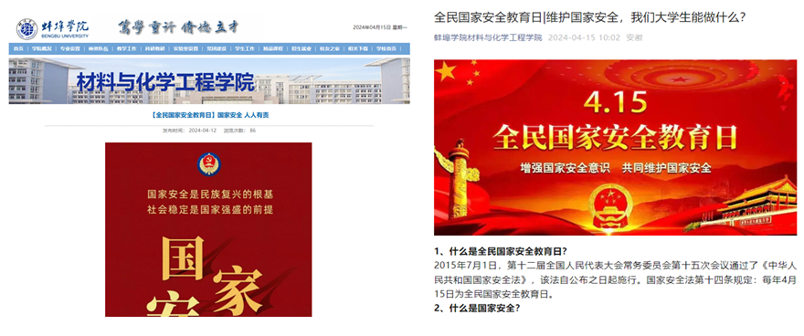 在总体国家安全观提出10周年之际,为提高同学们的国家安全意识,加强国家安全法律法规的宣传教育,材化学院开展了全民国家安全日主题教育系列活动。旨在提升同学们对国家安全重要性的理解,明确个人在维护国家安全中的责任和义务,同时也提高大家在日常生活中防范各种安全风险的意识。