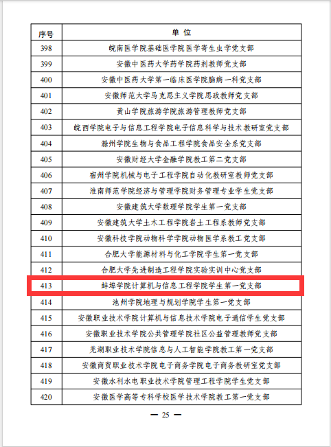 计算机与信息工程学院学生第一党支部始终坚持以习近平新时代中国特色社会主义思想为指导,深入学习贯彻党的二十大精神,聚焦高素质应用型计算机人才培养,对标“七个有力”,构建常态化学习教育、制度化党员发展、清单化责任落实和引领式作用发挥等四大党建工作机制,全面推行“134”育人体系建设和党团班一体化建设,推进支部党建与学生成长成才融合发展,扎实推动党建工作提质增效。2023年入选安徽省“党建工作样板支部”培育创建单位,2021年和2023年两次荣获蚌埠学院“先进基层党组织”称号;近三年来党支部共有18名党员获得省级“双优生”荣誉称号,5名党员获得国家奖学金;支部党员优秀学生奖学金覆盖率、学科竞赛获奖率、志愿服务和社会实践参与率均为100%。