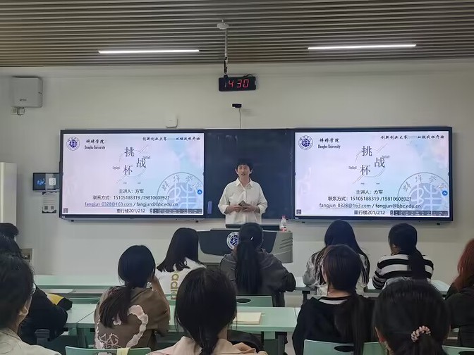 为了全面深化创新创业教育改革,进一步提升大学生创新创业能力,落实以赛促教、以赛促学、以赛促创的教学方针,4月24日下午,外国语学院邀请蚌埠学院创业导师材料与化学工程学院方军博士在B130开展了大学生创新大赛培训主题讲座。讲座由外国语学院创业导师徐善文主持,外国语学院英语专业2023级和2022级学生以及入驻蚌埠学院创业孵化基地的各项目组成员参加。