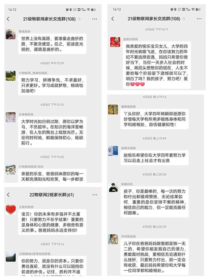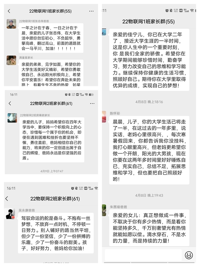 “努力学习,拼搏争先,不求最好,只求更好。学习成就梦想,杨靖怡加油吧!”这是21物联网杨靖怡家长的殷殷期待。“希望我的宝贝女儿杨蕊在大学4年,生活快乐,努力学习,拼搏向上,把你的人生创造地更精彩。”22物联网1班杨蕊家长这样鼓励孩子。“亲爱的儿子,时间如梭,马上大三了,爸爸希望你一定要有一个目标,自信、坚定、务实,围绕这个目标行动起来,不负青春,不负韶华。加油!”22物联网2班李昊学家长这样激励孩子。