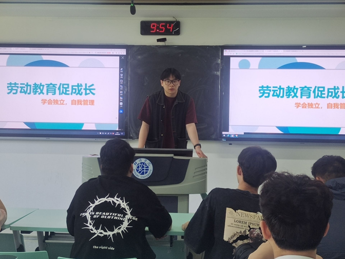 以劳动教育为载体培育劳动精神。5月7日-12日,学院21-23级各班举办以劳动教育宣传为主题的主题班会。在主题班会中,同学们集中学习了《关于全面加强新时代大中小学劳动教育的意见》,分享自己的劳动经验和专业思考,明确了大学生应当积极参加劳动的重要意义。在班会中,各班级组织学生观看“优秀企业家讲思政课”视频,使同学们了解我院校友如何实现自身就业创业梦想。通过优秀企业家的优秀品质给予学院学子积极学习的力量,帮助学生树立正确世界观、人生观、价值观,规划职业生涯、培养创业思维,勇担时代使命。