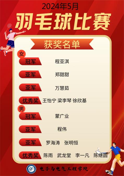 为丰富同学们课余生活,增强团队意识,增进体育文化交流,构建和谐青春校园,5月12日,电子与电气工程学院在校体育馆举办了2024年春季羽毛球比赛。