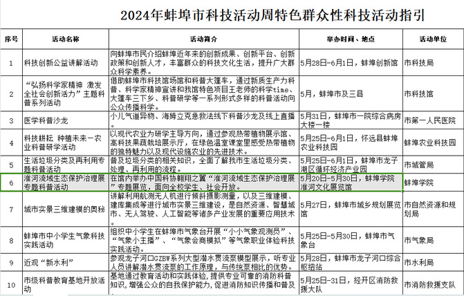 近日,在蚌埠市科技局《关于公布2024年蚌埠市科技活动周重点活动的通知》中,我校“淮河流域生态文明保护治理专题展”列为2024年蚌埠市科技活动周重点活动。