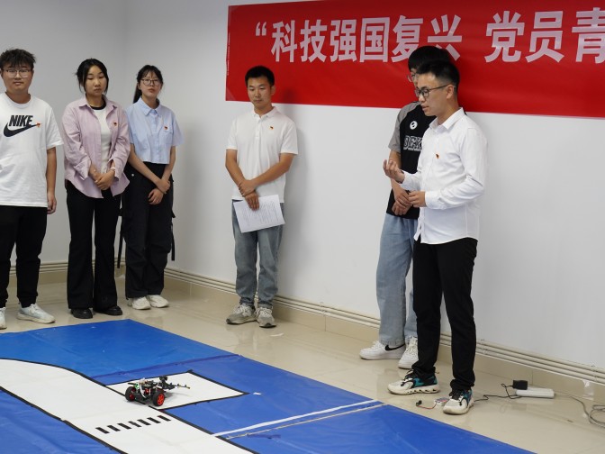本次活动以“科技强国复兴党员青年先行”为主题,共分现场展示、理论学习和研讨交流三个环节。现场展示环节中,21级网络工程专业学生党员伍旺旺结合全国大学生智能汽车竞赛参赛经历,现场展示了智能汽车竞赛过程,解读了智能车等学科竞赛蕴含的科技强国意义和时代内涵,分享了参加各类学科竞赛的收获与感受,在展现专业能力的同时让在场师生“沉浸式”体验了一场科技教育。
