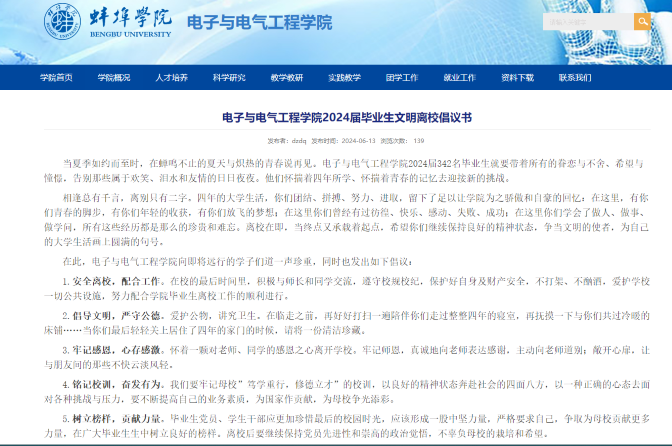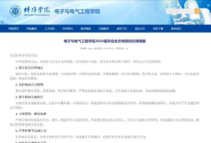 紧接着,辅导员带领同学们学习文件《电子与电气工程学院2024届毕业生离校工作方案》、《电子与电气工程学院2024届毕业生文明离校倡议书》和《电子与电气工程学院2024届毕业生文明离校纪律提醒》,强调了文明离校的重要性,指出这不仅是对学生个人安全的保障,更是对学校文明建设的贡献。希望同学们能够珍惜在校时光,遵守学校规章制度,以文明、有序的方式完成毕业前各项手续,充分展示电子与电气工程学院学子的良好形象。