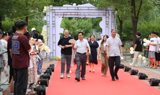 在鲜花、气球与灯光的簇拥中,蚌埠学院艺术设计学院党委书记高善春老师、院长胡飞老师、党委副书记李俊锦老师、副院长王磊老师、各专业老师、毕业班全体辅导员在学生们的欢呼声中,走过“毕业门”,来到同学们身边。