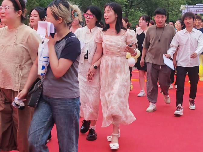 走红毯仪式是今天的第一大亮点。华灯初放,毕业生们或手捧鲜花,或与好友同行,或三五成群,脸上洋溢着青春与收获的笑容,自信满满地踏上红毯。典礼的举办不仅是对学子们四年辛勤付出的肯定,更是他们开启人生新旅程的庄严宣誓。
