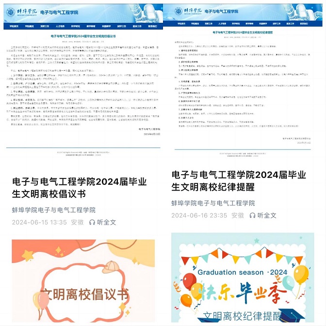 学院先后开展“文明离校,安全教育”主题班会、感恩诚信教育、就业创业指导和心理帮扶、毕业生党课教育,组织开展毕业生“青春记忆”照片征集活动、编写学子风采录、召开毕业生经验交流会、开展毕业生征兵宣传等,营造温馨毕业氛围,通过学院微信公众号、官网推送《电子与电气工程学院2024届毕业生文明离校倡议书》《电子与电气工程学院2024届毕业生文明离校纪律提醒》《2024届毕业生离校送站通知及离校须知》等文明离校宣传材料,引导毕业生顺利毕业、文明离校。
