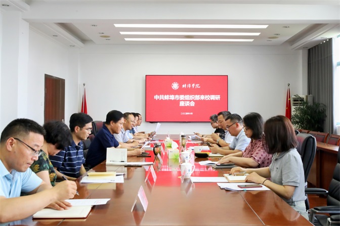 7月1日下午,蚌埠市市委组织部常务副部长、人才工作局局长陆开斌等一行到我校调研考察人才工作。校党委副书记、院长孙艳辉,党委委员副院长郭有强,组织部、人事处、科研处、教务处以及相关学院负责人参加。