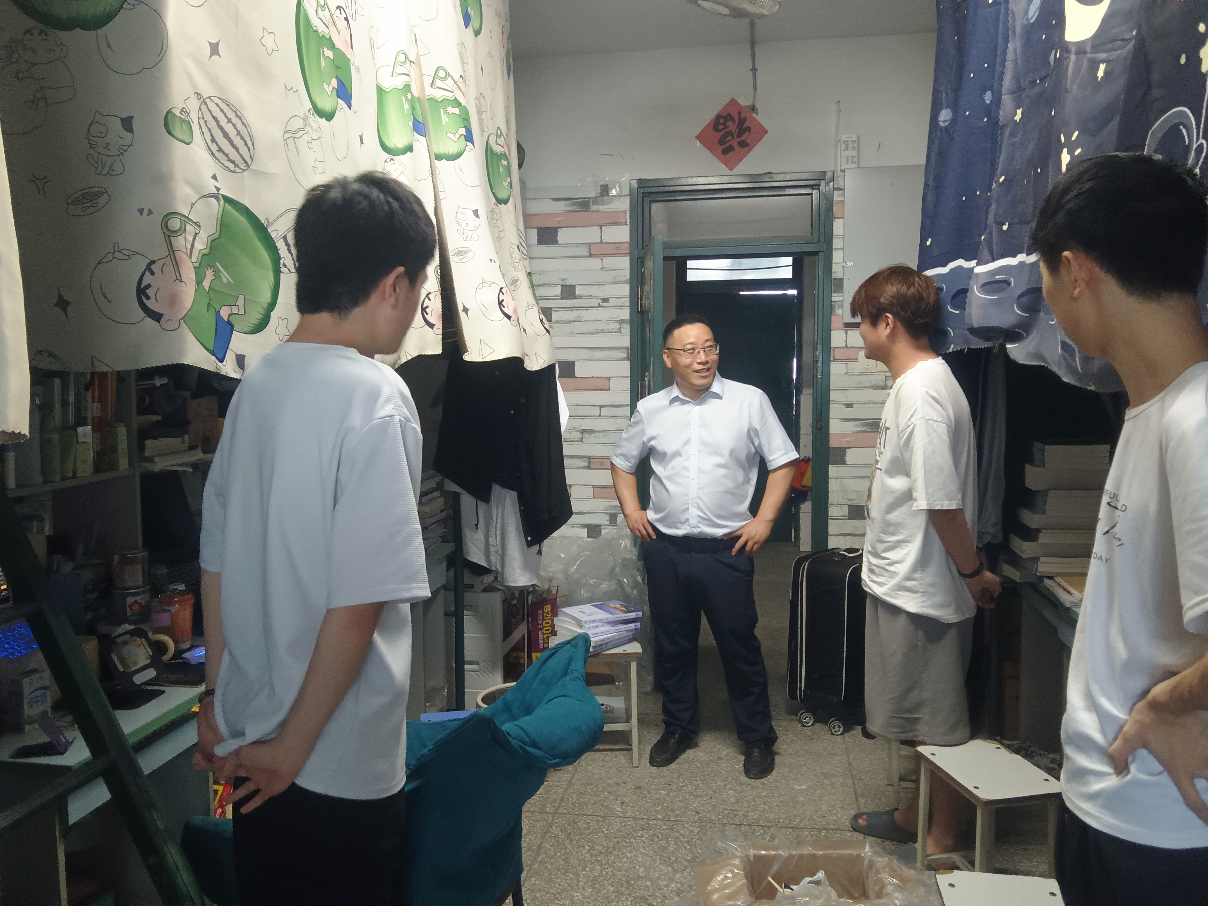 在走访过程中,每到一间寝室,学院领导都与同学们热情交谈,询问大家暑假生活情况、新学期的学习计划,并进行安全教育。认真查看了男生7、8号楼宿舍改造情况,以及女生3、4、5号宿舍楼女生宿舍搬迁后的情况,询问同学们的意见和感受。同时,还重点查看了宿舍的卫生状况和安全设施,对卫生整洁、学习氛围浓厚、富有特色的宿舍给予了充分肯定。对于个别存在问题的宿舍,现场提出整改意见,要求同学们增强自律意识,共同维护宿舍的整洁与安全。新学期,新起点,新征程,希望同学们以崭新的面貌,更加饱满的热情,投入到新学期的学习和生活中去,为了实现自己的梦想而努力奋斗!