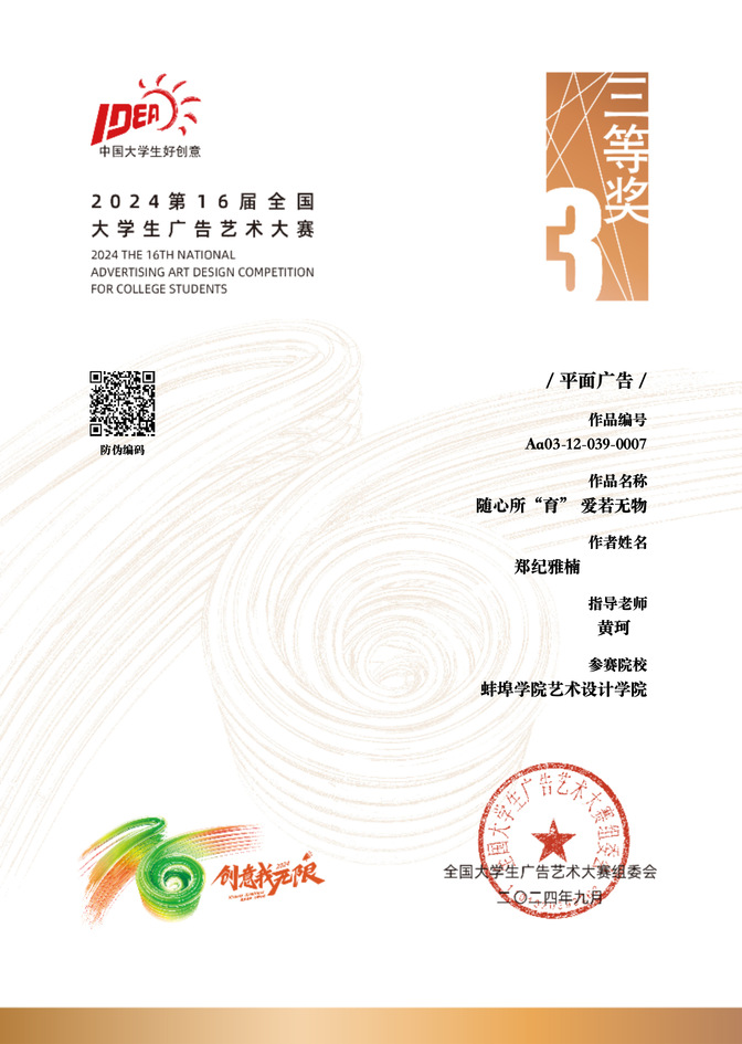 近日,第16届全国大学生广告艺术设计大赛获奖名单公布,艺术设计学院视觉传达设计专业郑纪雅楠同学的作品《随心所“育” 爱若无物》荣获国赛三等奖(指导教师:黄珂)。