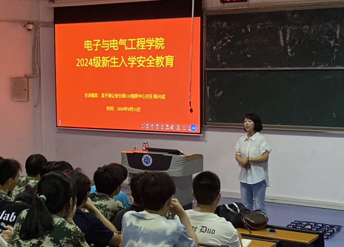 为使2024级新生增强对电信网络诈骗、反邪教的甄别能力与防范意识,9月11日晚7点至9点,电子与电气工程学院特邀龙子湖公安分局110指挥中心主任陈兴武在教学楼阶梯4教室开展2024级新生入学安全教育讲座。学院2024级354名新生及新生辅导员张继强参加此次讲座,讲座由党委副书记马程主持。