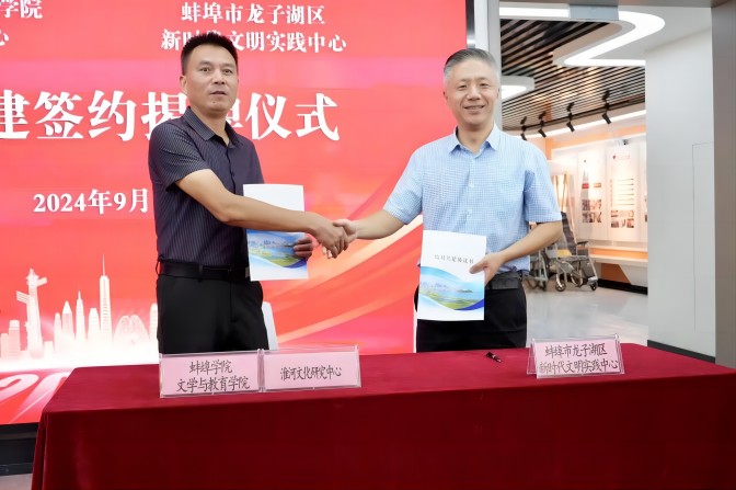 9月27日下午,为深入学习习近平新时代中国特色社会主义思想,学习贯彻党的二十大精神,党的二十届二中全会、党的二十届三中全会精神,拓宽新时代文明实践中心建设渠道,激活资源、激发活力,推动资源共享、阵地共建、活动共联、队伍共育,蚌埠学院文学与教育学院、淮河文化研究中心与龙子湖区新时代文明实践中心“文学与教育学院大学生实践基地暨中国科协‘翱翔之翼’大学生科技志愿服务基地”共建协议签订暨基地揭牌仪式在龙子湖区文明办举行。