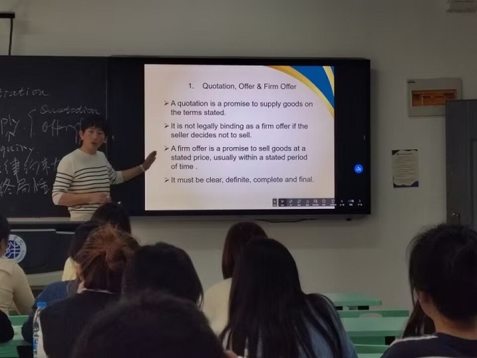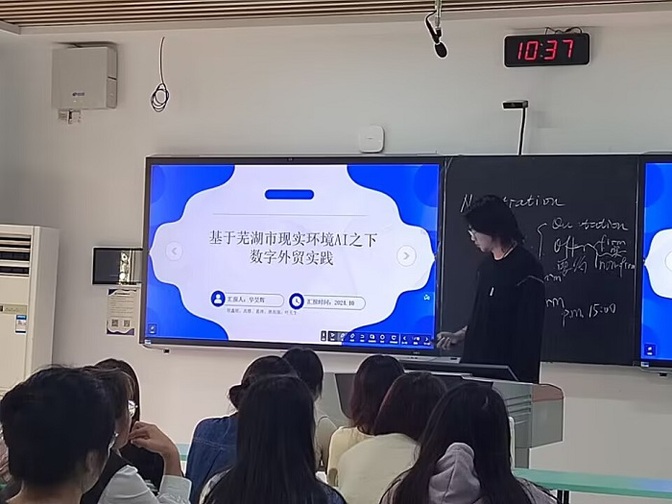 本次公开课的主讲内容为课程第六章——报价及报盘。授课分为三个部分。第一部分为复习与导入。在对上周所学内容进行简要复习后,课堂教学引入本次课的教学重点和难点。在介绍报价与报盘定义的基础上,借助安徽省内企业真实报盘函电实例,师生共同分析了报盘文本的结构和写作原则。在实例讲解中,通过AI生成文本与学生写作文本的差异对比、语言结构分析等找出实例中出现的一些不当之处,并强调严谨是报盘作为具有法律约束力文本写作的核心要求。公开课的第三部分为学生小组作业展示环节。各组团队合作开展项目式学习,分别汇报了安徽省内合肥、蚌埠等五个城市的产业发展政策、外贸发展形势及当地特色出口产品的详细英文描述,并现场借助人工智能根据本节课所学的写作原则和技巧生成报盘函。